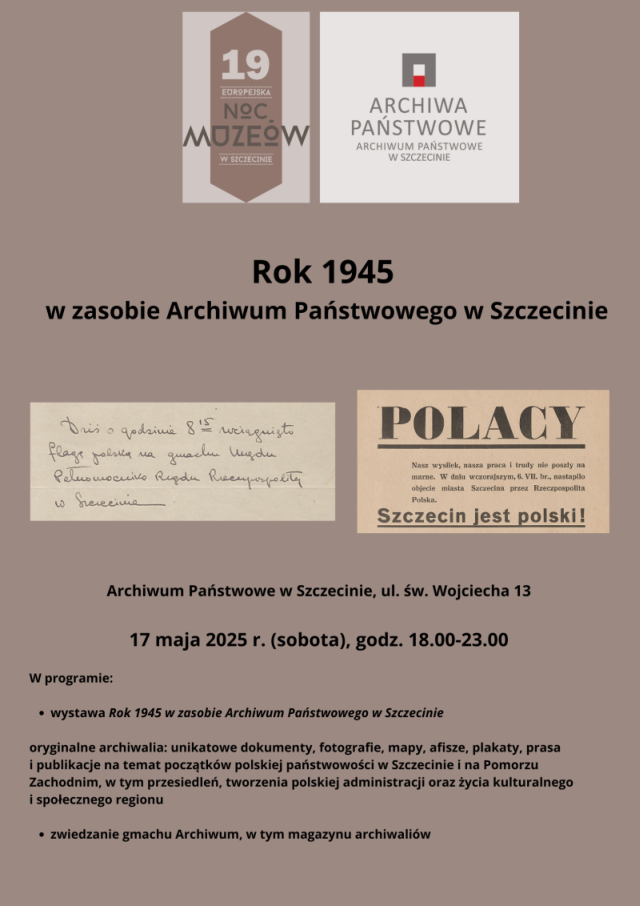 - wystawa oryginalnych archiwaliów z naszego zasobu, obrazujących początki polskiej państwowości w Szczecinie i na Pomorzu Zachodnim w 1945 roku, w tym budowę administracji, przesiedlenia, odbudowę, tworzenie się życia kulturalnego i społecznego. Będą to unikatowe dokumenty, fotografie, mapy, afisze, plakaty, prasa, publikacje książkowe;