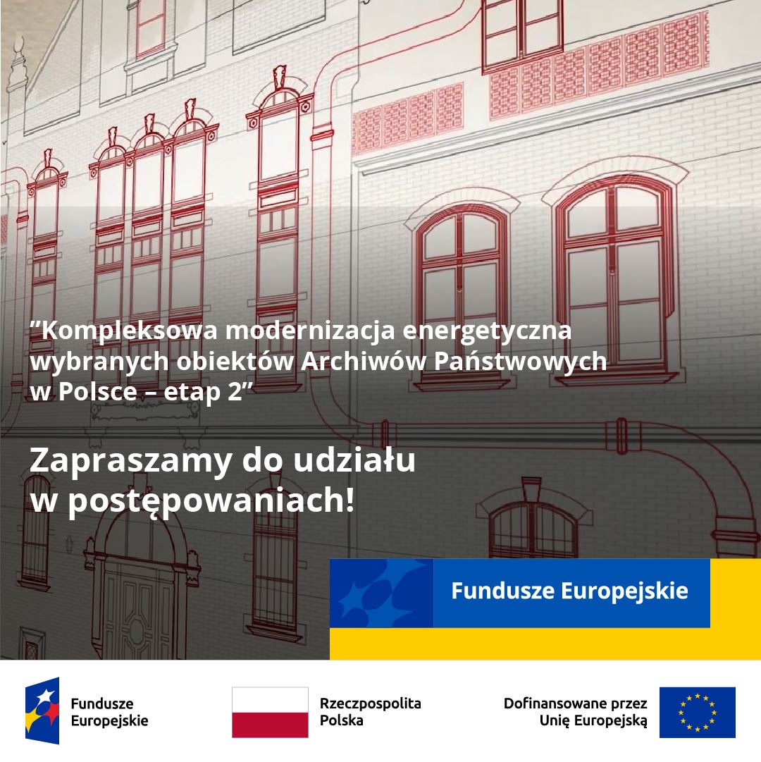 Projekt „Kompleksowa modernizacja energetyczna wybranych obiektów Archiwów Państwowych w Polsce – etap 2” współfinansowany jest przez Unię Europejską ze środków Funduszu Spójności oraz budżetu państwa w ramach Programu Fundusze Europejskie na Infrastrukturę, Klimat, Środowisko 2021-2027 w ramach priorytetu FENX.01 Wsparcie sektorów energetyka i środowisko.