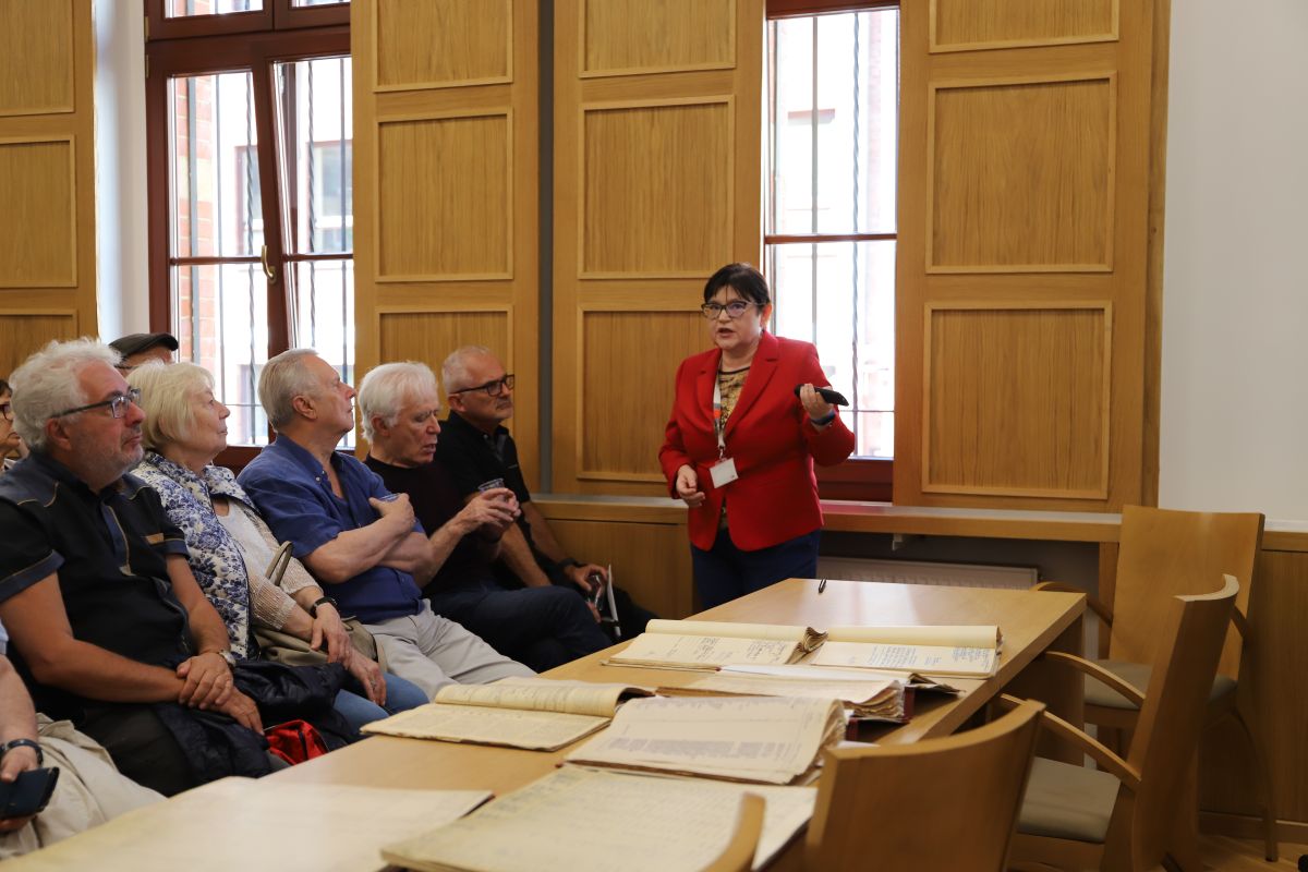 Nasi goście, którzy dzieciństwo i młodość spędzili w Szczecinie, a obecnie przybyli z różnych części świata, m.in. Izraela, Szwecji i Stanów Zjednoczonych, mieli okazję poznać możliwości korzystania z naszego zasobu choćby do celów genealogicznych. W trakcie wycieczki obejrzeli również nasz zabytkowy gmach oraz magazyn archiwalny, gdzie przybliżyliśmy zadania Archiwów państwowych oraz pokazaliśmy przykładowe, najcenniejsze archiwalia, m.in. dokumenty średniowieczne i nowożytne wystawione przez książąt pomorskich i królów polskich oraz pięknie oprawioną księgę miejską Człopy.